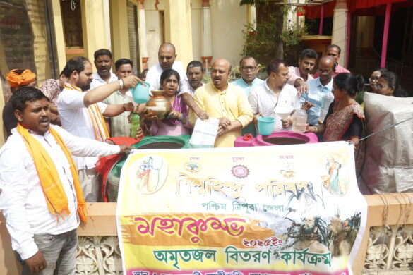 আগরতলা : আগরতলার আনন্দময়ী কালীবাড়িতে বিশেষ পূজা-অর্চনার মাধ্যমে সাধারণ মানুষের মধ্যে বিতরণ করা হয় মহাকুম্ভের অমৃত জল। এবছর ১৪৪ বছর পর হলো মহাকুম্ভ। আর সেখান থেকে পবিত্র গঙ্গা, যমুনা, সরস্বতীর জল নিয়ে এসেছে বিশ্ব হিন্দু পরিষদ। যারা বিভিন্ন কারণে আর্থিক কারণে পবিত্র মহাকুম্ভে যেতে পারেনি, তাদের জন্য এই পবিত্র অমৃত জল নিয়ে এসেছে বিশ্ব হিন্দু পরিষদ। ত্রিপুরার বিভিন্ন প্রান্তে এই জল বিতরণ করা হচ্ছে। পশ্চিম জেলার উদ্যোগে রবিবার আগরতলার আনন্দময়ী কালীবাড়িতে বিশেষ পূজা-অর্চনার মাধ্যমে সাধারণ মানুষের মধ্যে বিতরণ করা হয়। এই কর্মসূচী ঘিরে ব্যাপক উৎসাহ দেখা যায় সংগঠনের সদস্যদের মধ্যে।