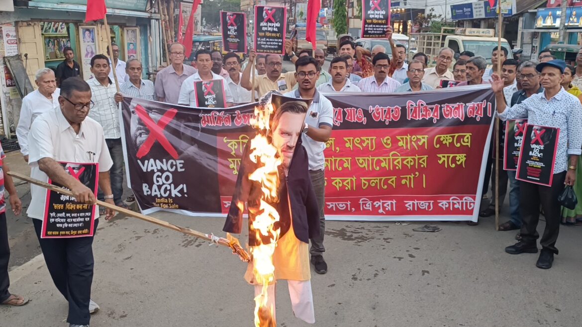 আগরতলা : মার্কিন উপরাষ্ট্রপতি ভ্যান্সে তুমি ফিরে যাও স্লোগান উঠল আগরতলায়। রাজধানীতে ভ্যান্সের কুশপুতুল পোড়ানো হয় কৃষকসভার তরফে।কৃষি, ডেয়ারি, ফল, মৎস্য ও মাংস ক্ষেত্রে মুক্ত বাণিজ্যের নামে আমেরিকার সঙ্গে অসম চুক্তি করা চলবে না। এই শ্লোগানকে সামনে রেখে সোমবার রাজধানী আগরতলা শহরে বিক্ষোভ কর্মসূচি সংগঠিত করল সারা ভারত কৃষক সভা। আগরতলা শহরের প্যারাডাইস চৌমুহনীতে হয় সংগঠনের তরফে পথসভা। সেখানে মার্কিন উপরাষ্ট্রপতি ভ্যান্সের কুশ পুত্তলিকা পোড়ানো হয়। পথ সভায় বক্তব্য রাখতে গিয়ে কৃষকসভার রাজ্য সম্পাদক পবিত্র কর বলেন আমেরিকা সহ ইউরোপীয় বহু দেশকে বাণিজ্যিক চুক্তির মাধ্যমে ভারতে ব্যবসা করার সুযোগ করে দেওয়া হয়েছে। এটা দেশের কৃষকরা মেনে নিতে পারবে না। তাই প্রতিবাদে সামিল হয়েছে সারা ভারত কৃষক সভা ত্রিপুরা রাজ্য কমিটি। ভারতবর্ষের বাজারকে আমেরিকার কাছে বিক্রয় করার সুযোগ বিজেপিকে দেওয়া হবে না। এই প্রতিজ্ঞা সকলকে নিতে হবে। সভায় উপস্থিত ছিলেন রাজ্য সম্পাদক ছাড়াও মতি লাল সরকার, রাজ কুমার চৌধুরী, মধু সূদন দাস সহ অন্যরা। কর্মসূচী থেকে দাবি জানানো হয় মার্কিন যুক্তরাষ্ট্রের সাথে বানিজ্য চুক্তি ও মুক্ত বানিজ্য সমস্তরকম আলোচনা থেকে ভারতকে সড়ে আসতে হবে।মার্কিন আদেশ নামার কাছে মোদী সরকারের আত্মসমর্পণ করা চলবে না।