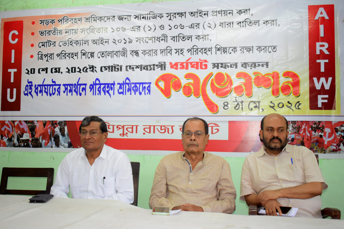 আগরতলা : ২০ মে দেশব্যাপী ধর্মঘট।এই ধর্মঘটের বার্তা ছড়িয়ে দিতে ত্রিপুরায়ও চলছে ব্যাপক প্রচার। রাজ্যের বিভিন্ন জায়গায় চলছে কনভেনশন। রবিবার পরিবহণ শ্রমিকদের নিয়ে হয় গণকনভেনশন সি আই টি ইউ রাজ্য দপ্তরে।শ্রমিক বিরোধী চারটি শ্রম আইন বাতিল করার আহবানে ২০ মে সারা দেশব্যাপী সাধারণ ধর্মঘট বিভিন্ন এই কনভেনশন থেকে পরিবহন শ্রমিকরা আওয়াজ তুলে সড়ক পরিবহণ শ্রমিকদের জন্য সামাজিক সুরক্ষা আইন প্রণয়ন, ভারতীয় ন্যায় সংহিতার ১০৬-এর ১ ও ১০৬-এর ২ ধারা বাতিল,মোটর ভেহিক্যাল আইন ২০১৯ সংশোধনী বাতিল করার।ত্রিপুরা রাজ্যে পরিবহণ শিল্পে তোলবাজি বন্ধ সহ পরিবহণ শিল্পকে রক্ষা করতে হবে। এদিনের কনভেনশনে উপস্থিত ছিলেন সিআইটিইউ-র সভাপতি মানিক দে, অমল চক্রবর্তী, তপু ঘোষ সহ অন্যরা। ধর্মঘট সফল করার বার্তা দেওয়া হয় এদিনের কনভেনশন থেকে।