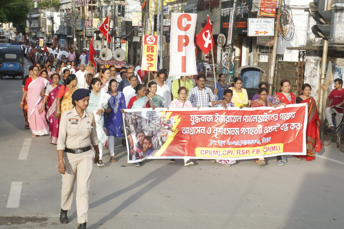 আগরতলা : গাজায় ইজরায়েলের হামলার প্রতিবাদে পথে নামলো ৫ বাম দল। সর্বভারতীয় কর্মসূচীর অংস হিসেবে মঙ্গলবার রাজ্যের বিভিন্ন জায়গায় হয় প্রতিবাদ বিক্ষোভ কর্মসূচী। এদিন বিকেলে আগরতলা শহরেও বাম দল গুলির কর্মী- সমর্থকরা রাস্তায় নামেন। এদিন মেলারমাঠ সিপিএম অফিসের সামনে থেকে বের হয় মিছিল। স্লোগান সোচ্চার মিছিল শহরের বিভিন্ন পথ পরিক্রমা করে প্যারাডাইস চৌমুহনীতে সভায় মিলিত হয়। উপস্থিত ছিলেন সিপিএম নেতা মানিক দে, পবিত্র কর, রতন দাস, শরিক দলের নেতৃত্ব জয় গোবিন্দ দেবরায়, পরেশ সরকার, মিলন বৈদ্য সহ অন্যরা। সভায় আলোচনা করতে গিয়ে নেতৃত্ব মার্কিন সাম্রাজ্যবাদের সমালোচনা করেন। তারা অভিযোগ করেন এখন পর্যন্ত ৫৫ হাজারের উপর মানুষ গাজায় মারা গেছে। মার্কিন সাম্রাজ্যবাদের মদতে ইজরায়েল হামলা চালিয়ে যাচ্ছে। গাঁজার পর ইজরায়েল এখন ইরানেও হামলা চালাচ্ছে। যদিও পাল্টা ইরানও হামলা করেছে।