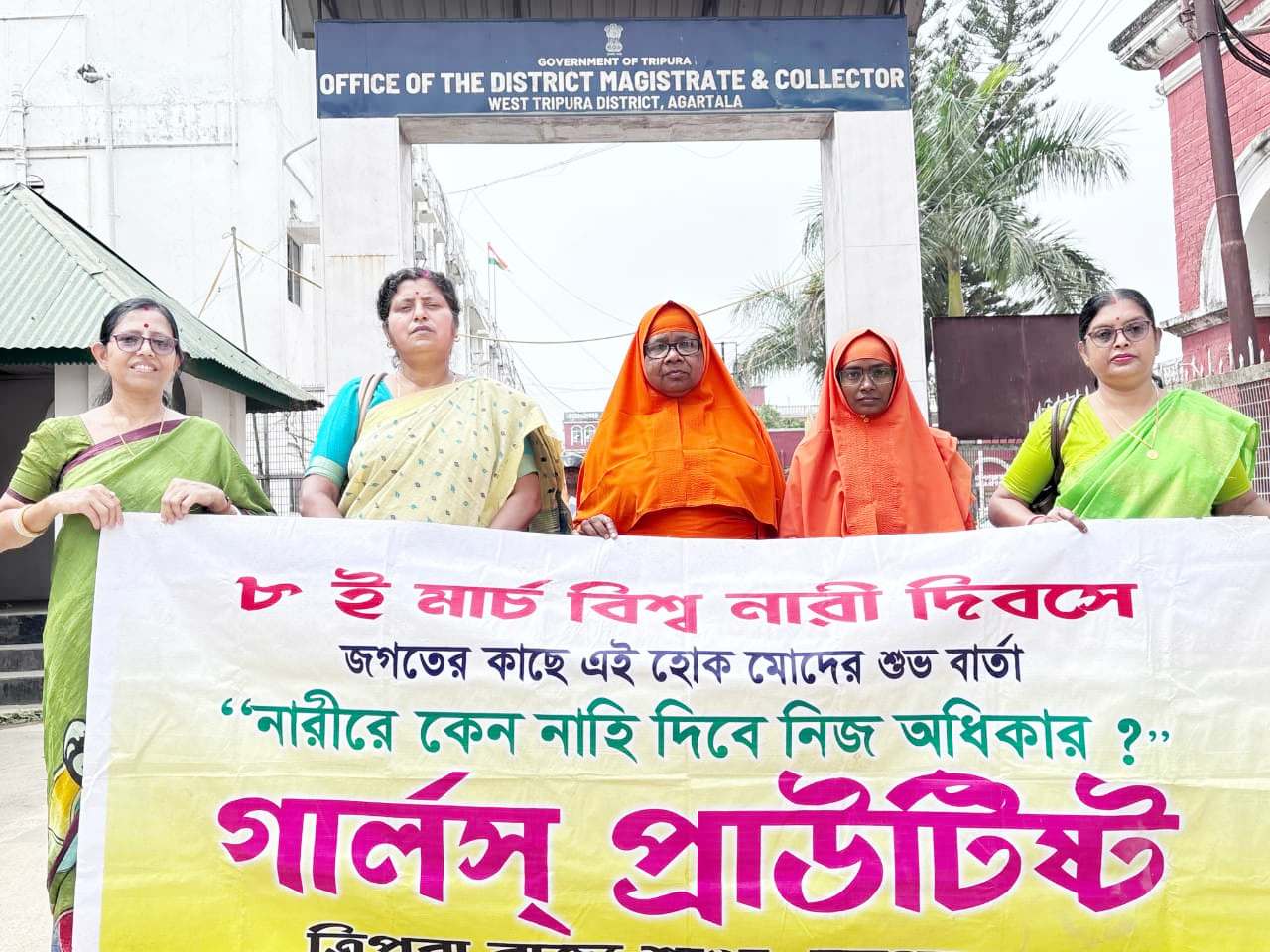 আগরতলা : বিশ্ব নারী দিবসক উপলক্ষ্যে নারী জাতির জাগরনে, উত্তরনে ও কল্যান কামনায় গার্লস প্রাউটিষ্ট ত্রিপুরা রাজ্য শাখার উদ্যোগে মুখ্যমন্ত্রীর উদ্দেশ্যে পশ্চিম ত্রিপুরা জেলার জেলা শাসকের নিকট ডেপুটেশান প্রদান করা হয়। মূলত ১১ দফা দাবিকে সামনে রেখে এই ডেপুটেশান প্রদান করা হয়। তাদের দাবি গুলির মধ্যে রয়েছে সমাজে শিক্ষা, কর্মসংস্থান সহ সর্বক্ষেত্রে লিঙ্গ বৈষম্য পরিহার করে নারীকে পুরুষের সমান মর্যাদা ও অধিকার দিতে হবে। নার্সারী থেকে বিশ্ববিদ্যালয় স্তর পর্যন্ত নারী শিক্ষাকে সম্পূর্ণ ফ্রী করতে হবে। প্রাথমিক স্তর পর্যন্ত শিক্ষাদানের দায়িত্ব নারীদের উপর অর্পন করতে হবে। নারী ধর্ষনকে নারী হত্যার সমতুল্য জ্ঞানে বিচার করে দোষীদের দৃষ্টান্তমূলক শাস্তি দিতে হবে। টিভি, ভিডিও, সিনেমা বিজ্ঞাপনে নারীদেহের নগ্নছবি প্রদর্শন, অশ্লীল সাহিত্য ও যৌন উদ্দীপক অসংস্কৃতি সম্প্রচার পুরোপুরি নিবিদ্ধ করতে হবে। পণ ও যৌতুক প্রথা সমাজ থেকে সমূলে উচ্ছেদ করতে হবে। নারীদের আত্মরক্ষার প্রশ্নে বিদ্যালয় স্তর থেকেই জুডো, ক্যারাটের প্রশিক্ষনের ব্যবস্থা করতে হবে। কর্মসংস্থান ছাড়াও পঞ্চায়েত স্তর থেকে লোকসভা পর্যন্ত নারীদেরকে পুরুষদের সমান প্রতিনিধি করার অধিকার দিতে হবে। নারীদের অর্থনৈতিক স্বাবলম্বীতা অর্জনের জন্য অগ্রাধিকারের ভিত্তিতে যথোপযুক্ত কর্মসূচী প্রণয়ণ করতে হবে। মদ, গাঁজা সহ সব ধরনের ড্রাগ, উৎপাদন, বিপনন বন্ধ করে সংশ্লিষ্টদের বিকল্প কর্মসংস্থানের ব্যবস্থা করতে হবে। সমাজে সব ধরনের শোষন রুখতে অর্থনীতির বিকেন্দ্রীকরণ ও সামাজিক অর্থনৈতিক অঞ্চল গড়ে তুলতে হবে।