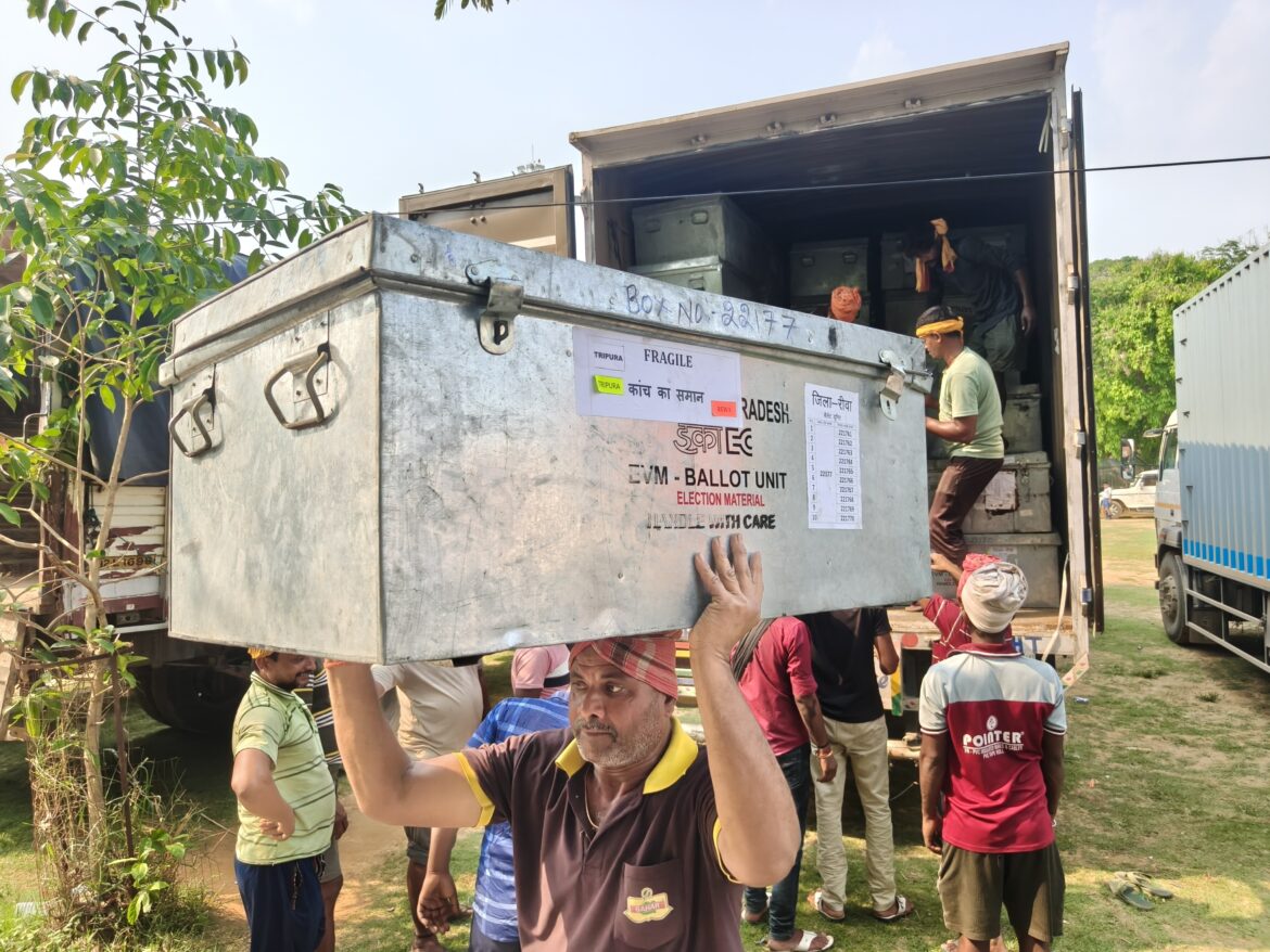 আগরতলা : ১২ এপ্রিল এডিসি নির্বাচনের ভোট গ্রহণ। এডিসি নির্বাচনকে সামনে রেখে মধ্য প্রদেশ থেকে রাজ্যে এসে পৌছাল ইভিএম মেশিন। উমাকান্ত স্কুলের মাঠ থেকে ইভিএম মেশিন গুলি সংশ্লিষ্ট জেলার স্ট্রং রুমের উদ্দেশ্যে প্রেরন করা হচ্ছে। রাজ্য নির্বাচন কমিশনের সচিব অনুরাগ সেন জানান মধ্য প্রদেশ থেকে প্রায় ৩ হাজার ৫০০ ইভিএম মেশিন রাজ্যে এসেছে। বৃহস্পতিবারের মধ্যে এই ইভিএম মেশিন গুলি সংশ্লিষ্ট জেলার স্ট্রং রুমে প্রেরন করা হবে।