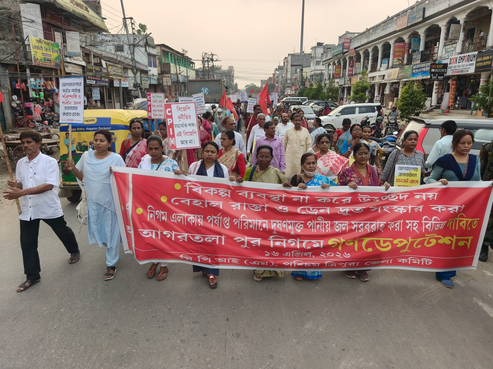 আগরতলা : আগরতলা পুর নিগমের বিভিন্ন সমস্যা নিয়ে আগরতলা শহরে বিক্ষোভ মিছিল সিপিআইএম-এর। সিপিআইএম পশ্চিম জেলা কমিটির উদ্যোগে মিছিল শেষে পুর নিগমে ডেপুটেশন প্রদান করা হয়। এইদিন প্রথমে সিপিআইএম পশ্চিম জেলা কমিটির পক্ষ থেকে এক মিছিল সংগঠিত করা হয় আগরতলা শহরে। মূলত বিকল্প ব্যবস্থা না করে উচ্ছেদ না করা, বেহাল রাস্তা ও ড্রেন দ্রুত সংস্কার করা, নিগম এলাকায় পর্যাপ্ত পরিমাণে দূষণ মুক্ত পানীয় জল সরবরাহ করার দাবিতে এইদিনের বিক্ষোভ মিছিল ও গনডেপুটেশান প্রদান করা হয়। এইদিনের মিছিলের অগ্র ভাগে ছিলেন সিপিআইএম নেতা মানিক দে, প্রাক্তন সাংসদ শঙ্কর প্রসাদ দত্ত সহ অন্যান্যরা। এইদিন মিছিল শেষে আগরতলা পুর নিগমে গনডেপুটেশান প্রদান করা হয়। এক সাক্ষাৎকারে মানিক দে জানান পুর নিগম গঠিত হওয়ার পর আগরতলা শহরের উন্নতি হয়েছে। তা কেউ অস্বীকার করতে পারবে না। কিন্তু বিজেপি সরকার প্রতিষ্ঠা হওয়ার পর নিগম বাসীর উপর একের পর এক করের বোঝা চাপিয়ে দিচ্ছে। কিন্তু সেই অনুযায়ী পরিষেবা কিছু নেই। নিয়মিত আগরতলা শহর এলাকার আবর্জনা সাফাই করা হয় না। নিষ্কাশনি ব্যবস্থা অবহেলিত, বৃষ্টি হলেই আগরতলা শহরের বেশকিছু এলাকা জলে ডুবে যায়। তার সাথে যুক্ত হয়েছে উচ্ছেদ অভিযান। বিকল্প কোন ব্যবস্থা না করে গায়ের জোরে উচ্ছেদ অভিযান করা হচ্ছে একের পর এক।