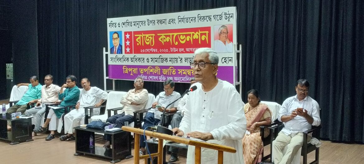 আগরতলা : যারা ছেড়ে চলে গেছে, কথা বলতে চাইছেন না তাদের শত্রু ভাববেন না। তাদের গালমন্দ দেওয়ার প্রয়োজন নেই। কথা বলার সুযোগ থাকলে বলবেন। কাজেই যে শক্তি রয়েছে একে সংহত করে এগিয়ে যাওয়ার চেষ্টা করুণ। এর জন্য কর্মসূচী উপস্থিত করা হয়েছে।কর্মসূচীকে সফল করার চেষ্টা করতে হবে। শনিবার আগরতলা টাউন হলে এক কনভেনশনে একথা বললেন সিপিএম পলিট ব্যুরো সদস্য তথা প্রাক্তন মুখ্যমন্ত্রী মানিক সরকার। দলিত ও শশিত মানুষের উপর বঞ্চনা এবং নির্যাতনের বিরুদ্ধে গর্জে উঠার আহ্বানে সাংবিধানিক অধিকার ও সামাজিক ন্যায়ের লড়াইয়ে শামিল হওয়ার আহ্বানে এদিন ত্রিপুরা তপশিলি জাতি সমন্বয় সমিতির রাজ্য ভিত্তিক কনভেনশন হয় আগরতলা টাউন হলে। রাজ্যের বিভিন্ন প্রান্ত থেকে প্রতিনিধিরা এতে অংশ নেন। উপস্থিত ছিলেন দলিত শোষণ মুক্তি মঞ্চের সর্বভারতীয় সম্পাদক রামচন্দ্র ডোম, প্রাক্তন মুখ্যমন্ত্রী মানিক সরকার, সিপিএম রাজ্য সম্পাদক জিতেন চৌধুরী, ত্রিপুরা তপশিলি জাতি সমন্বয় সমিতির রাজ্য সভাপতি রতন ভৌমিক, সম্পাদক সুধন দাস, ঝর্ণা দাস বৈদ্য, দিলিপ দাস সহ অন্যরা। কনভেনশনে আলোচনা করতে গিয়ে মানিক সরকার বলেন, এখানে সংগ্রামের ময়দানে মানুষকে যতবেশি সমবেত করা যাবে ২০২৪ সালের লোকসভা নির্বাচনকে সামনে রেখে বিরোধীদের মঞ্চ থেকে বিজেপিকে হঠানোর জন্য যে লড়াইয়ের বার্তা সাধারণ মানুষের মধ্যে নিয়ে যাওয়ার চেষ্টা করা হচ্ছে আমাদের ভুমিকা সেটাকে শক্তি যোগাবে। আলোচনা করতে গিয়ে রামচন্দ্র ডোম মোদী জমানায় দেশের বর্তমান অবস্থা তুলে ধরেন।