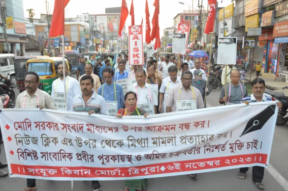 আগরতলা : নিউজ ক্লিকের বিশিষ্ট সাংবাদিক প্রবীর পুরকায়স্থ ও অমিত চক্রবর্তীকে গ্রেপ্তারের প্রতিবাদে দেশব্যাপী কর্মসূচী হাতে নেয় সংযুক্ত কিষান মোর্চা।সংগঠন সোমবার দেশব্যাপী প্রতিবাদ সংগঠিত করে। এদিন রাজ্যেও হয় সংগঠনের তরফে বিক্ষোভ কর্মসূচী। এদিন নেয় সংযুক্ত কিষান মোর্চা ত্রিপুরার উদ্যোগে রাজ্যের বিভিন্ন মহকুমায় হয় প্রতিবাদ বিক্ষোভ মিছিল- সভা। আগরতলায়ও হয় অনুরূপ কর্মসূচী। এদিন বিকেলে সংগঠনের পক্ষ থেকে বের হয় বিক্ষোভ মিছিল। মেলারমাঠ থেকে মিছিল বের হয়ে শহরের বিভিন্ন পথ ঘুরে পরে প্যারাডাইস চৌমুহনীতে পথ সভা সংগঠিত করে। উপস্থিত ছিলেন সংযুক্ত কিষান মোর্চার রাজ্য আহ্বায়ক পবিত্র কর, রতন দাস, ভানু লাল সাহা, জয় গোবিন্দ দেবরায়, শ্যামল দে সহ অন্যরা।