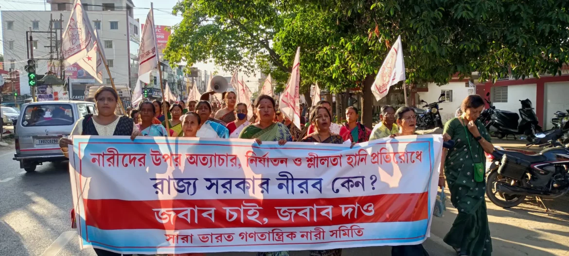 আগরতলা : গোটাদেশে নারীদের আজকে নিরাপত্তা নেই। একই অবস্থা ত্রিপুরায়।এই রাজ্যে নারীদের নিরাপত্তা দিতে ব্যর্থ বিজেপি সরকার। পুলিস ভুমিকা নিচ্ছে না। নারী ঘটিত অপরাধের ঘটনায় যুক্তরা প্রকাশ্যে ঘোরাফেরা করছে। এসব অভিযোগ এনে রাজ্যে প্রতিবাদ কর্মসূচী সারা ভারত গণতান্ত্রিক নারী সমিতির। শনিবার সংগঠনের উদ্যোগে রাজ্যের বিভিন্ন মহকুমায় হয় মিছিল- সভা। এদিন আগরতলায়ও হয় প্রতিবাদ মিছিল। রাজধানীর প্যারাডাইস চৌমুহনী থেকে বের হয় মিছিল। শহরের বিভিন্ন পথ পরিক্রমা করে। মিছিলে ছিলেন নারী নেত্রী স্বপ্না দত্ত, কৃষ্ণা রক্ষিত, ছায়া বল সহ অন্যরা।