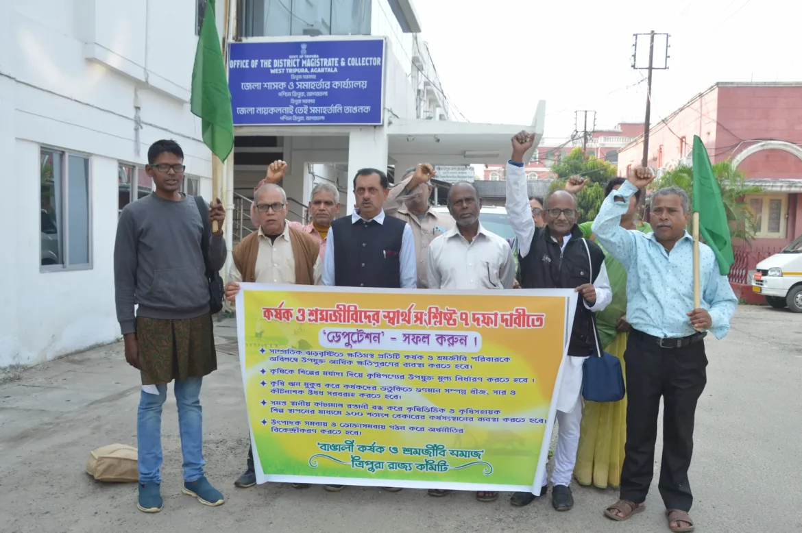 আগরতলা : অকাল বর্ষণে ক্ষতিগ্রস্ত কর্ষক ও শ্রমজীবীদের সরকারি আর্থিক সহায়তা প্রদানের দাবি জানালো বাঙালি কর্ষক ও শ্রমজীবী সমাজের রাজ্য কমিটি।শনিবার সংগঠনের উদ্যোগে ডেপুটেশন দেওয়া হয় পশ্চিম জেলার জেলা শাসকের কাছে।মুখ্যমন্ত্রীর উদ্দেশ্যে এদিন তারা এই সাত দফা স্মারকলিপি জমা দেয়।প্রতিনিধি দলে ছিলেন সংগঠনের রাজ্য নেতৃত্ব বিমল দাস সহ অন্যরা। তাদের দাবির মধ্যে রয়েছে গুণমান সম্পন্ন বীজ, ষাঁড় ওষুধ কৃষকদের ন্যায্যমূল্যে সরবরাহ করা, সমস্ত কৃষি ফসলকে কৃষি বিমার আওতায় আনা, সমস্ত চাষযোগ্য জমিকে সেচের আওতায় আনা, কৃষি ঋণ মকুব, সম্প্রতি প্রাকৃতিক দুর্যোগে ক্ষতিগ্রস্ত কৃষক ও শ্রমজীবীদের আর্থিক ক্ষতিপূরণের ব্যবস্থা করার দাবি তাদের।