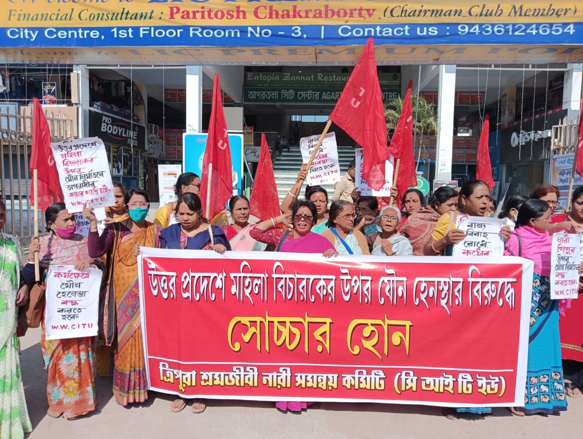 আগরতলা : উত্তরপ্রদেশের বান্দ্রাতে একজন মহিলা বিচারক অন্যদের যৌন নির্যাতনের শিকার হয়েছেন বলে অভিযোগ। অভিযোগ নির্যাতিতা নিজে বিচারক হয়েও এখন পর্যন্ত কোন বিচার পান নি। এই ঘটনার প্রতিবাদ জানিয়ে রাজপথে নামল সি আই টি ইউ অনুমোদিত ত্রিপুরা শ্রমজীবী নারী সমন্বয় কমিটি। শনিবার সংগঠনের তরফে প্রতিবাদ- বিক্ষোভ কর্মসূচী গ্রহণ করা হয়। সংগঠনের উদ্যোগে আগরতলার সিটি সেন্টারের সামনে বিক্ষোভ প্রদর্শন করেন সংগঠনের সদস্যারা। ঘটনাটি ঘটেছে ২০২২ সালে। কিন্তু বিষয়টি নজরে আসে চলতি মাসে।উপস্থিত ছিলেন ত্রিপুরা শ্রমজীবী নারী সমন্বয় কমিটির নেতৃত্ব পাঞ্চালী ভট্টাচার্য, জয়া বর্মণ সহ অন্যরা। এদিনের কর্মসূচী থেকে দাবি জানানো হয় নারী- শিশুদের উপরে যৌন নির্যাতন বন্ধের।পাঞ্চালী ভট্টাচার্য অভিযোগ করেন গোটা দেশে নারীরা কাজের জায়গায় বিষণ ভাবে আক্রান্ত হচ্ছেন।