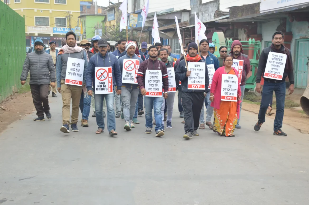 আগরতলা : চাই প্রতি হাতে কাজ, নেশা মুক্ত সমাজ। এই আহ্বানে কন কনে ঠাণ্ডার মধ্যেই সকালে রাস্তায় নেমে পড়লেন বাম যুব সংগঠনের কর্মীরা। বৃহস্পতিবার আগরতলা শহরে তারা বিক্ষোভ মিছিল- সভা করেন। এদিন ভারতের গণতান্ত্রিক যুব ফেডারেশনের রাজ্য সম্পাদক নবারুণ দেবের নেতৃত্বে শহরে মিছিল বের হয়। যুব কর্মীরা প্ল্যাকার্ড নিয়ে শহর পরিক্রমা করে পরে পুরনো মোটর স্ট্যান্ড এলাকায় পথসভায় মিলিত হন। যুব নেতা নবারুণ দেব অভিযোগ করেন বেকারদের কাজ নেই।