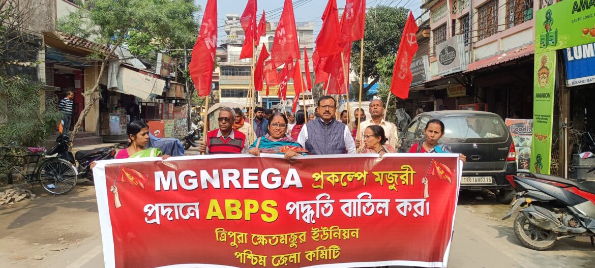 আগরতলা : কেন্দ্রীয় সরকার এম জি এন রেগা প্রকল্পে আধার ভিত্তিক মজুরি শ্রমিকদের দেওয়ার সিদ্ধান্ত গ্রহণ করেছে। এর প্রতিবাদ জানিয়েছে সারা ভারত কৃষি শ্রমিক ইউনিয়ন। এর প্রতিবাদ জানিয়ে মঙ্গলবার গোটা দেশে মিছিল- সভা সংগঠিত করে। ত্রিপুরায় পথে নাম ত্রিপুরা ক্ষেত মজুর ইউনিয়ন। এদিন আগরতলায় সংগঠনের পশ্চিম জেলা কমিটির তরফে হয় বিক্ষোভ মিছিল। মেলারমাঠ থেকে বের হয় স্লোগান সোচ্চার মিছিল। শহরের বিভিন্ন পথ পরিক্রমা করে। মিছিলের নেতৃত্বে ছিলেন সংগঠনের রাজ্য সম্পাদক শ্যামল দে সহ অন্যান্য নেতৃত্ব। শ্যামল দে এদিন বলেন, গোটা দেশে রেগায় জব কার্ড হোল্ডার হচ্ছেন ২৫ কোটি ৩৫ লাখ। তিনি বলেন, কেন্দ্রের পদ্ধতি মতো জব কার্ড হোল্ডারের আধারের সঙ্গে ব্যাঙ্ক লিঙ্ক করার পদ্ধতিতে দেশে প্রায় সাড়ে সাত কোটি জব কার্ড হোল্ডার বাদ পড়েছেন। এর প্রভাবে রাজ্যেও পড়েছে। ত্রিপুরায় জব কার্ড হোল্ডার ৬ লাখ ২৫ হাজারের মতো। তাতে প্রায় ১ লাখ জব কার্ড হোল্ডার বাদ পড়বে। তাই এই প্রতিবাদ কর্মসূচী থেকে দাবি জানানো হয় মজুরি প্রদানে এ বি পি এস পদ্ধতি প্রত্যাহার করার।