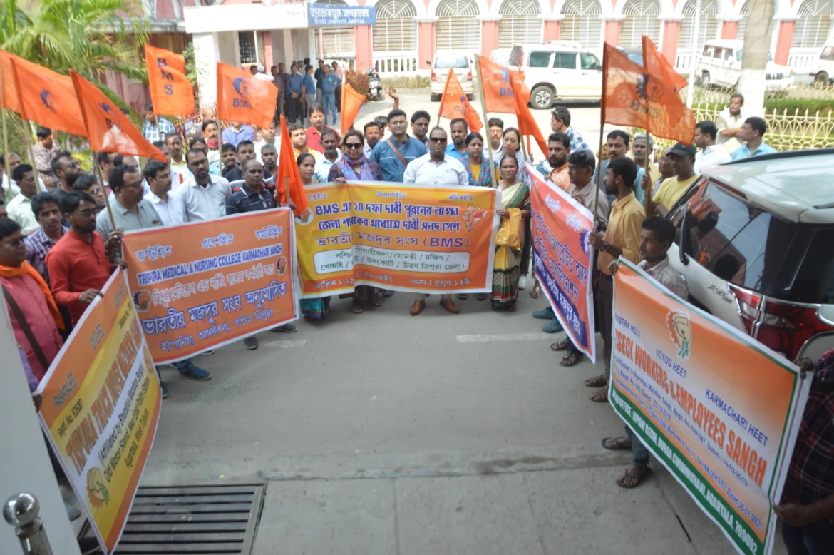 আগরতলা : রাজ্যজুড়ে একদিনে সমস্ত জেলায় জেলা শাসকদের কাছে স্মারকলিপি পেশ করলো ভারতীয় মজদুর সংঘের বিভিন্ন জেলা কমিটি। বেশকিছু দাবি সনদ তারা পেশ করেন শ্রমিক-শিক্ষক কর্মচারীদের স্বার্থ সংশ্লিষ্ট। মুখ্যমন্ত্রীর উদ্দেশ্যে জেলা শাসকদের কাছে স্মারকলিপি জমা দেওয়া হয়। সংগঠনের পশ্চিম জেলা কমিটিও ডেপুটেশন দেয় জেলা শাসকের কাছে বৃহস্পতিবার। এক প্রতিনিধি দল দেখা করেন পশ্চিম জেলা জেলা শাসকের সঙ্গে। তাদের ২০ দফা দাবির মধ্যে রয়েছে ত্রিপুরা মেডিকেল কলেজ ও হাসপাতাল এবং ত্রিপুরা কলেজ অব নার্সিং এর সমস্ত কর্মচারীদের সমস্যার স্থায়ী সমাধান। আগরতলা সরকারি মেডিকেল কলেজের মতো তাদের বেতনভাতা সহ সমস্ত সুযোগ সুবিধা প্রদান করা,রাজ্য সরকারের কর্মচারীদের মধ্যে বেতন অসঙ্গতি অবিলম্বে বন্ধ করা এবং বিভিন্ন এলাউন্স কেন্দ্রীয় সরকারের কর্মচারীদের মত হুবহু দেওয়া, রাজ্য সরকারের অধীনস্থ সকল ক্যাজুয়াল, পার্ট টাইম, ডিআরডব্লিউ কর্মচারীদের নিয়মিত কর্মচারীদের মতো বেতন প্রদান করা এবং ফি ফিক্সড পে কর্মচারীদের ৫ বছরের পরিবর্তে তিন বছরে নিয়মিতকরণ, ৫০ বছরের মধ্যে কোন কর্মচারী মৃত্যু হলে আগের নিয়মমতো সেই মৃত কর্মচারীর পরিবারের কোন যোগ্য প্রার্থীকে সরকারি চাকরির সুযোগ দেওয়া, ত্রিপুরা রাজ্য সরকারের অধীনস্থ সমস্ত সরকারি কর্মচারীদের বকেয়া ২৬ শতাংশ মহার্ঘ্যভাতা মিটিয়ে দেওয়া,আশা অঙ্গনওয়াড়ি কর্মীদের সান্মানিক ভাতা ও অবসরকালীন ভাতা বৃদ্ধি, ত্রিপুরার একমাত্র মাঝারি শিল্প কেন্দ্র জুটমিলকে রাজ্যের স্বার্থে অবিলম্বে চালু করা, পরিবহন শ্রমিক কল্যাণ বোর্ড গঠন, যানবাহনের জ্বালানির ওপর রাজ্য সরকারের ট্যাক্সের ৫০ শতাংশ ছাড় দেওয়া সহ বিভিন্ন দাবি ভারতীয় মজদুর সংঘ ত্রিপুরা প্রদেশের।