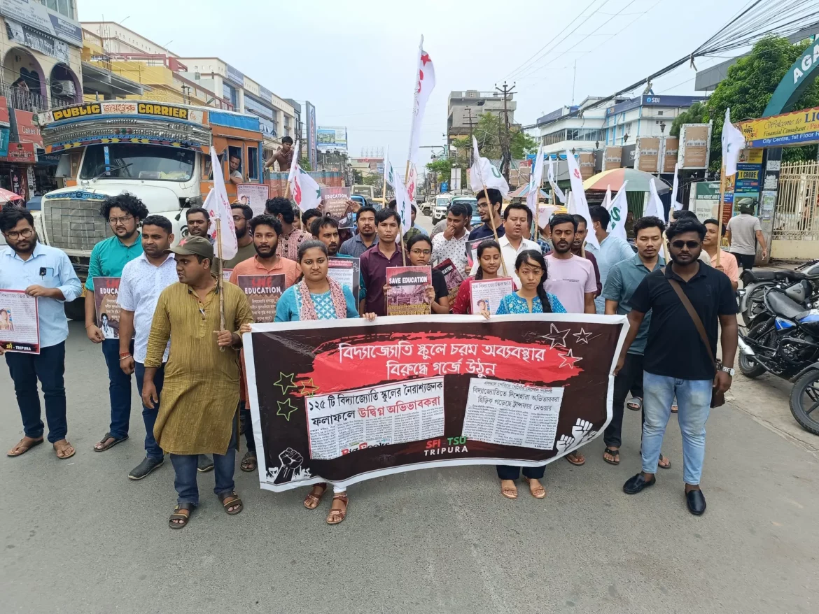 আগরতলা : বিদ্যাজ্যোতি স্কুলগুলির মাধ্যমিক ও দ্বাদশের নিরাশাজনক ফলাফল নিয়ে সোচ্চার বামপন্থী ছাত্র সংগঠনদ্বয় ভারতের ছাত্র ফেডারেশন ও উপজাতি ছাত্র ইউনিয়ন। রবিবার আগরতলা শহরে রাজপথে বিক্ষোভ মিছিল করে সরকারের তরফে স্পষ্টীকরণের দাবি জানানো হয়। মিছিল থেকে দুই ছাত্র সংগঠনের তরফে দাবি জানানো হয়েছে বিদ্যাজ্যোতির যেসব স্কুলে বাংলা মাধ্যমে লেখাপড়ার জন্য ভর্তি হয়েছিল পড়ুয়ারা তাদের বাংলাতে লেখাপড়া ও পরীক্ষার সুযোগ দেওয়া এবং ইংরেজি মাধ্যমের পড়ুয়াদের ইংরেজিতে পরীক্ষার সুযোগ দেওয়ার।এজন্য প্রয়োজনীয় পদক্ষেপ সরকারকে গ্রহণ করতে হবে। বিদ্যাজ্যোতি প্রকল্প যেভাবে মুখথুবড়ে পড়েছে এবং সরকার এসব ঢাকার জন্য যেভাবে নীরব থাকছে এর বিরোধিতা করে দুই সংগঠন। এদিন বিকেলে মেলারমাঠ ছাত্র-যুব ভবনের সামনে থেকে বের হয় বিক্ষোভ মিছিল। শহরের বিভিন্ন পথ পরিক্রমা করে বাম ছাত্র সংগঠনদ্বয়ের বিক্ষোভ মিছিল।এসএফআই রাজ্য সম্পাদক সন্দীপন দেব বলেন,রাজ্যের বিদ্যাজ্যোতি স্কুলের পড়ুয়াদের উপরে একটা অবর্ণনীয় দুর্দশা নেমে এসেছে। এজন্য দায়ী রাজ্যের বিজেপি সরকার। বিদ্যাজ্যোতি স্কুলের নিরাশাজনক ফলাফল নিয়ে সরকারের তরফে কোন বক্তব্য এখনও শোনা যায়নি বলে অভিযোগ।এদিন কর্মসূচীতে উপস্থিত ছিলেন ছাত্র নেতা সুলেমান আলি, সন্দীপন দেব, নেতাজী দেববর্মা, সুজিত ত্রিপুরা সহ অন্যরা।
