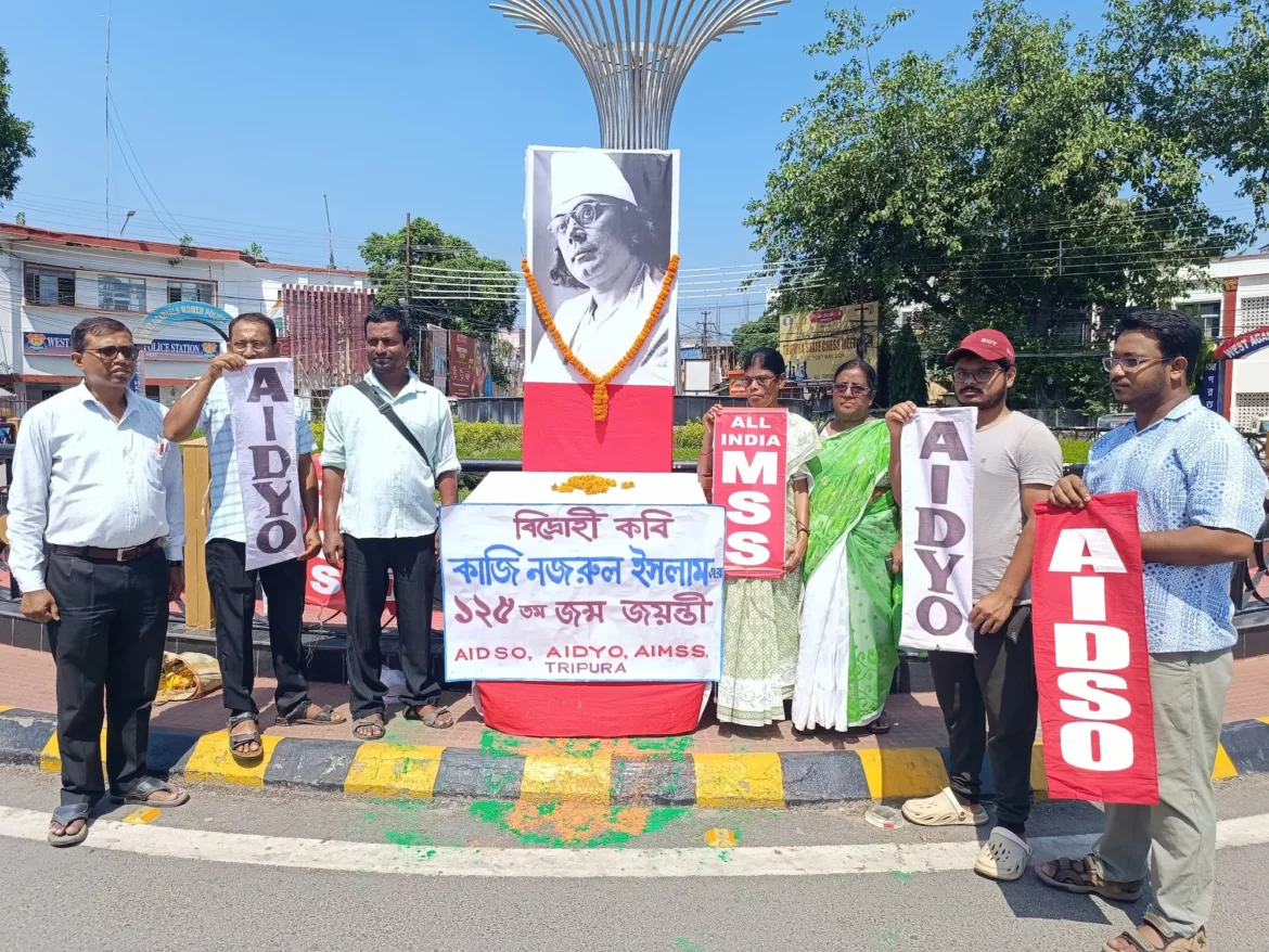 আগরতলা : প্রতিবছরের মতো এবারো সরকারি-বেসরকারি উদ্যোগে কাজী নজরুল ইসলামের জন্মদিন পালন করা হয়।অন্যান্য বছরের মতো এবারো এআইডিএসও, এআইডিওয়াইও, এআইএমএসএস-র তরফে হয় নজরুল স্মরণ। রাজ্যের বিভিন্ন জায়গায় তিন সংগঠনের পক্ষ থেকে জন্মজয়ন্তীতে শ্রদ্ধা জানানো হয় কাজী নজরুলকে। এদিন সকালে আগরতলা পোস্ট অফিস চৌমুহনীতে কেন্দ্রীয় ভাবে হয় অনুষ্ঠান। সেখানে উপস্থিত ছিলেন যুব নেতা ভবতোষ দে, ছাত্র নেতা মৃদুল কান্তি সরকার সহ অন্যরা। তারা নজরুল প্রতিকৃতিতে শ্রদ্ধা জানান ফুলমালা দিয়ে। এদিন যুব নেতা বলেন, আজকে নেশা যেভাবে ছাত্র যুবদের মধ্যে ছড়িয়ে পড়েছে, অপসংস্কৃতি যেভাবে ছড়িয়ে পড়েছে ,শাসক দল যেভাবে অপসংস্কৃতিকে প্রশ্রয় দিচ্ছে এর বিরুদ্ধে বিদ্রোহ ঘোষণা প্রয়োজন।