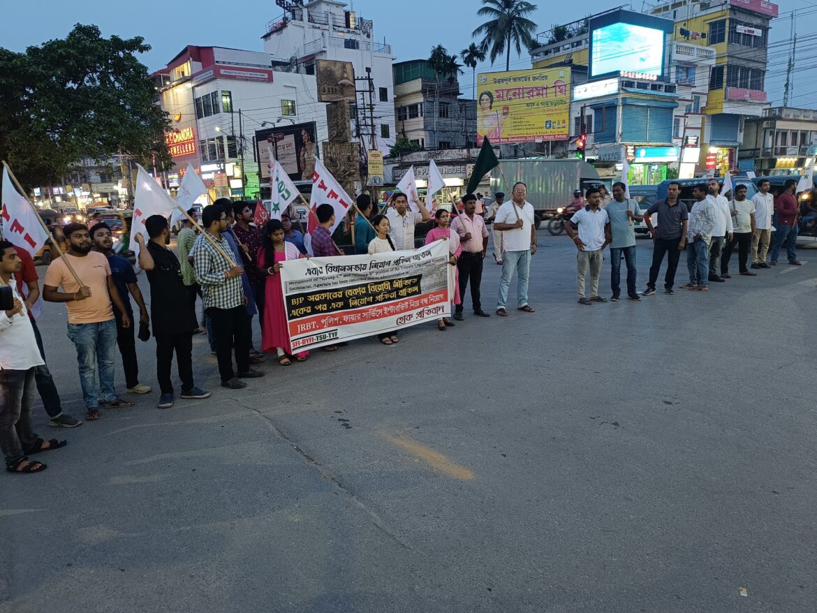 ত্রিপুরা আগরতলা : ত্রিপুরা বিধানসভায় নিয়োগ প্রক্রিয়া বাতিল করার প্রতিবাদ জানিয়ে রাজপথে নামল বাম ছাত্র যুব সংগঠন ভারতের গণতান্ত্রিক যুব ফেডারেশন, উপজাতি যুব ফেডারেশন, ভারতের গণতান্ত্রিক ছাত্র ফেডারেশন ও উপজাতি ছাত্র ইউনিয়ন। শুক্রবার বিকেলে চার ছাত্র-যুব সংগঠনের নেতা-কর্মীরা নিয়োগ প্রক্রিয়া বাতিলের প্রতিবাদ জানিয়ে বিক্ষোভ মিছিল বের করে। রাজধানীর মেলারমাঠ থেকে বের হয় মিছিল। নেতৃত্ব দেন নবারুণ দেব,পলাশ ভৌমিক, কৌশিক রায় দেববর্মা, সন্দীপন দেব, সুজিত ত্রিপুরা, সুলেমান আলি সহ অন্যরা। তারা রাজধানীর পোস্ট অফিস চৌমুহনী পর্যন্ত ঘুরে এসে আচমকা প্যরাডাইস চৌমুহনীতে পথ অবরোধ করে বসে।পথ অবরোধের ফলে ব্যস্ততম সময়ে যানবাহন আটকে যায়।পরে ১০ মিনিট পর তারা পথ অবরোধ তুলে নেয়। বাম ছাত্র যুব নেতৃত্বের অভিযোগ, বিজেপি সরকারের বেকার বিরোধী নীতিতে একের পর এক নিয়োগ প্রক্রিয়া বাতিল হচ্ছে। উল্লেখ্য, ত্রিপুরা বিধানসভায় গ্রুপ-সি ও গ্রুপ-ডি ৩৭ টি পদে লোক নিয়োগের বিজ্ঞপ্তি দেওয়া হয়েছিল। বেকাররা আবেদনও করেছিলেন। কিন্তু শুক্রবার আচমকা তা বাতিল করে দেওয়া হয় বিধানসভার তরফে। পাশাপাশি আরও অভিযোগ টি আই টিতে ৬ টি সহকারী অধ্যাপকের পদে নিয়োগের জন্য টি পি এস সি যে নিয়োগ বিজ্ঞপ্তি দিয়েছিল তাও বাতিল করে দেওয়া হয়। এর তীব্র নিন্দা জানান বাম ছাত্র-যুব নেতৃত্ব।তারা বিজেপি সরকারকে বেকার বিরোধী বলে আখ্যা দেন।