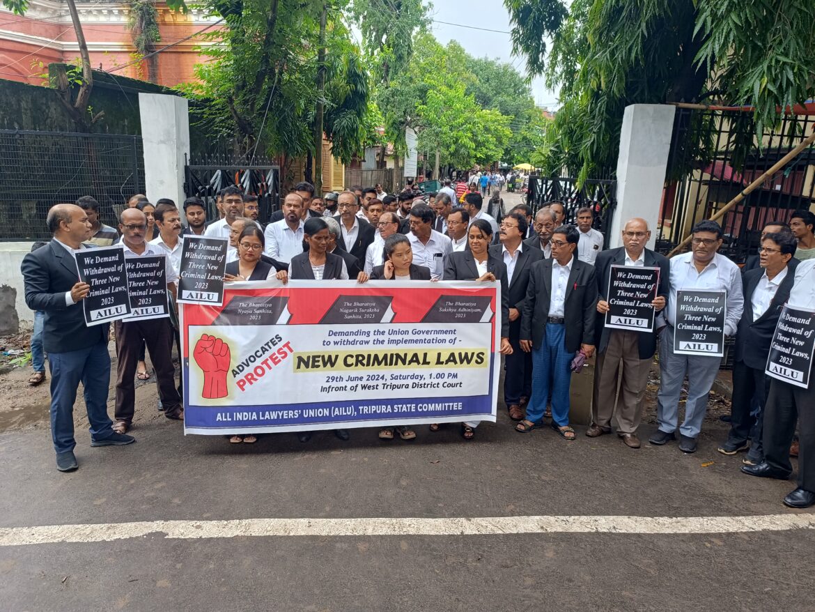 ত্রিপুরা আগরতলা : সারা দেশের সঙ্গে রাজ্যেও আন্দোলনে নামলো আইনজীবীরা। শনিবার আগরতলা আদালতের সামনে বিক্ষোভ দেখান আইনজীবীরা। সারা ভারত আইনজীবী ইউনিয়নের ত্রিপুরা রাজ্য কমিটির সভাপতি হরিবল দেবনাথ সকলের কাছে আহ্বান রাখেন কেন্দ্রের নতুন ফৌজদারি আইনের বিরুদ্ধে এগিয়ে আসার।তিনি মন্তব্য করেন নতুন তিন আইন গণতন্ত্র ও জন বিরোধী। পাশাপাশি এই আইন প্রত্যাহার করে আলোচনার মাধ্যমে নতুন করে আইন আনার দাবি জানান। আগামী ১ জুলাই থেকে কার্যকরী হওয়ার কথা কেন্দ্রের তিনটি নতুন আইন।এর প্রতিবাদ জানিয়ে দেশজুড়ে আন্দোলনে নেমেছে সারা ভারত আইনজীবী ইউনিয়ন। সারা দেশের কর্মসূচীর অঙ্গ হিসেবে শনিবার রাজ্যেও আন্দোলনে নামে সংগঠনের ত্রিপুরা রাজ্য কমিটি।তিনটি নতুন ফৌজদারী আইন প্রত্যাহার করার দাবিতে সংগঠনের সদস্যরা বিক্ষোভ প্রদর্শন দেখায়। নতুন তিন আইন প্রত্যাহারের দাবিতে আগামী দিনেও যে আন্দোলন চলবে তা এক প্রকার স্পষ্ট।