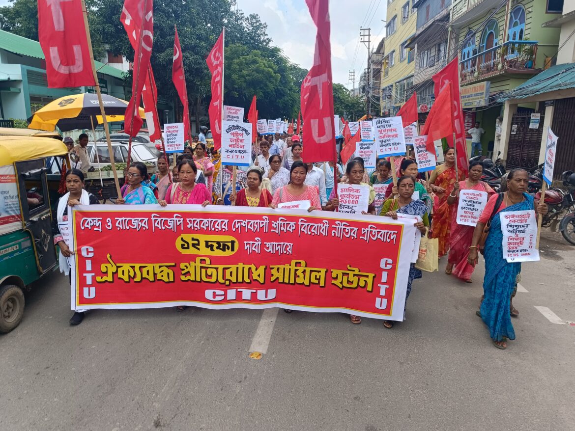 ত্রিপুরা আগরতলা : ভারত বাসী লোকসভা নির্বাচনে বিজেপির নীতির বিরুদ্ধে পরিষ্কার পরিচ্ছন্ন রায় দিয়েছেন। বিজেপিকে ছোট করে দিয়েছে।কিন্তু তৃতীয় বারের মতো সরকারে এসে বিজেপি একই কায়দায় তাদের নিতিগুলি কার্যকর করতে শুরু করেছে।দেশে ঠিকা শ্রমিকের নামে মানুষের উপরে অত্যাচার চলছে। ১৭-১৮ ঘণ্টা কাজ করিয়ে মজুরি দেয় খুব কম।কেন্দ্র রাজ্যের সরকার এসব করছে। এই অভিযোগ করলেন সি আই টি ইউর রাজ্য সভাপতি মানিক দে। তিনি জানান এর বিরুদ্ধে সকল অংশের মানুষকে ঐক্যবদ্ধ করে রাস্তায় নামানোর সিদ্ধান্ত হয়েছে।এই কর্মসূচীর অঙ্গ হিসেবে বুধবার আগরতলা শহরে হয় বিক্ষোভ মিছিল- সভা। এদিন রাজধানীর অফিস লেন সি আই টি ইউ অফিসের সামনে থেকে বের হয় মিছিল। স্লোগান সোচ্চার মিছিল শহরের বিভিন্ন পথ পরিক্রমা করে ওরিয়েন্ট চৌমুহনীতে সভায় মিলিত হয়। কর্মসূচীতে ছিলেন শ্রমিক নেতা মানিক দে, পাঞ্চালী ভট্টাচার্য সহ অন্যরা। তাদের ১২ দফা দাবির মধ্যে রয়েছে শ্রমিক স্বার্থ বিরোধী শ্রম কোড বাতিল, ঢালাও বেসরকারীকরন প্রক্রিয়া বন্ধ,ঠিকাদারী কাজে শ্রমিকের নিরাপত্তা নিশ্চিত করা, প্রকল্প কর্মীদের পেনশন গ্র্যাচুয়িটি সহ সকল সামাজিক নিরাপত্তা দেওয়ার।