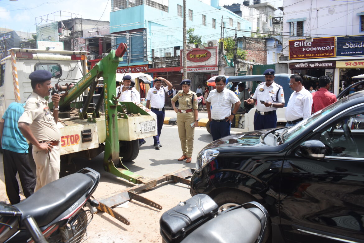 আগরতলা : রাজধানীতে অবৈধ পার্কিং বন্ধে ট্রাফিকের তরফে প্রায়শই যানবাহন চালকদের সতর্ক করা হয়। কিন্তু এর পরেও শহরের বিভিন্ন জায়গায় অবৈধ ভাবে যানবাহন পার্কিং করে রাখে একাংশ যানবাহন চালক। ফলে মানুষের চলাচল করতে সমস্যায় পড়তে হয়। তাই দুর্গা পূজার প্রাক মুহূর্তে শহরে ফের অভিযান। বৃহস্পতিবার ট্রাফিক, পুর নিগম, পরিবহণ দপ্তর ও পুলিসের যৌথ উদ্যোগে চলে বিভিন্ন জায়গায় অভিযান। দুর্গা পূজাকে সামনে রেখে এইদিন পোস্ট অফিস চৌমুহনী থেকে কামান চৌমুহনী পর্যন্ত অভিযান চালানো হয়। এদিন অবৈধভাবে পার্কিং করা একাধিক বাইককে জরিমানা করা হয়। একটি গাড়িকে ক্রেন দিয়ে তুলে নিয়ে যাওয়া হয়। একটি অটোতে নোটিস লাগিয়ে দেওয়া হয়। পরিবহন দপ্তরের এক আধিকারিক জানান দুর্গা পুজার আগে মানুষ যেন স্বাচ্ছন্দ্যে আগরতলা শহরে চলাফেরা করতে পারে তার জন্য অভিযান চলে। যান চালকদের একাধিকবার সতর্ক করা হয়েছে। তাই এদিন যারা যানবাহন অবৈধ ভাবে পার্কিং করেছে তাদের বিরুদ্ধে ব্যবস্থা গ্রহণ করা হচ্ছে। এ ধরণের অভিযান আগামী দিনেও জারি থাকবে বলে জানান এক পুলিস আধিকারিক।