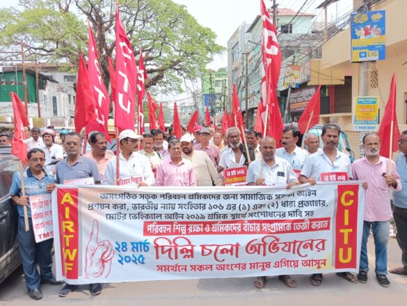 আগরতলা : ২৪ মার্চ সংসদ অভিযান করবে পরিবহণ শ্রমিকরা। দাবি আদায়ে সংসদ অভিযানের বার্তায় আগরতলা শহরে মিছিল- সভা করলো অল ইন্ডিয়া রোড ট্রান্সপোর্ট ওয়ার্কার্স ফেডারেশন ত্রিপুরা শাখা। সোমবার রাজধানীর অফিসলেনস্থিত সিআইটিইউ অফিসের সামনে থেকে শুরু হয় এই মিছিল। শহরের বিভিন্ন পথ পরিক্রমা করে মিছিলটি। পরে হয় সভা। উপস্থিত ছিলেন সিআইটিইউর রাজ্য সভাপতি মানিক দে, সংগঠনের নেতা অমল চক্রবর্তী সহ অন্যান্যরা। সি আই টি ইউ রাজ্য সভাপতি মানিক দে বক্তব্য রাখতে গিয়ে বলেন, দেশের সরকার নীতি না পালটালে গোটা দেশ আগামী দিনে অচল করে দেবে পরিবহণ শ্রমিকরা। তিনি বলেন সারাদেশে প্রায় ১০ কোটির অধিক পরিবহন শ্রমিক কর্মরত রয়েছেন। কিন্তু বর্তমান সরকারের আমলে তাদের জীবন জীবিকা সবদিক থেকে আক্রান্ত। তাদের বেতন ভাতা যেমন সঠিকভাবে প্রদান করা হয় না, তেমনি তাদের চিকিৎসার জন্য কোন ব্যবস্থাপনা নেই। তিনি আরও বলেন রাজ্য গুলির জন্য পরিবহন শ্রমিকদের স্বার্থে যে মজুরি নির্ধারণ করা আছে সেটা বাস্তবের সাথে সংঙ্গতিহীন। তাদের দাবির মধ্যে রয়েছে অসংগঠিত পরিবহন শ্রমিকদের জন্য সামাজিক সুরক্ষা আইন প্রণয়ন করা, মোটর ভেহিক্যাল আইন ২০১৯ শ্রমিক স্বার্থে সংশোধনের দাবি সহ ১৬ দফা দাবি।
