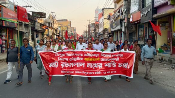 আগরতলা : বিরোধী দলনেতাকে জাত নিয়ে মন্ত্রী রতন লাল নাথের আক্রমণের বিরুদ্ধে রাজপথে নামলো সিপিএম। মঙ্গলবার সিপিএম পশ্চিম জেলা কমিটির তরফে আগরতলা শহরে বিক্ষোভ মিছিল করা হয়। এদিন মেলারমাঠ থেকে বের হয় মিছিল। স্লোগান সোচ্চার মিছিল শহরের বিভিন্ন পথ পরিক্রমা করে পরে সভায় মিলিত হয়। বিক্ষোভ মিছিল থেকে দাবি জানানো হয় মন্ত্রী রতন লাল নাথের বিরুদ্ধে ব্যবস্থা নেওয়া হয়। মিছিলে ছিলেন সিপিএম নেতা মানিক দে, ভানু লাল সাহা, শঙ্কর প্রসাদ দত্ত সহ অন্যরা। তারা কড়া সমালোচনা করেন বিধানসভায় মন্ত্রী রতন লাল নাথের মন্তব্যের জন্য। তাদের অভিযোগ ফ্যাসিবাদিরা সব সময় জাতি বিদ্বেষী হয়। বিধানসভায় জঘন্য নজির স্থাপন করা হয়েছে মন্ত্রী রতন লাল নাথের এ ধরণের মন্তব্য।বিরোধী দলনেতার সঙ্গে মন্ত্রীর অশোভন আচরণ বিধানসভার ইতিহাসে নজিরবিহীন।