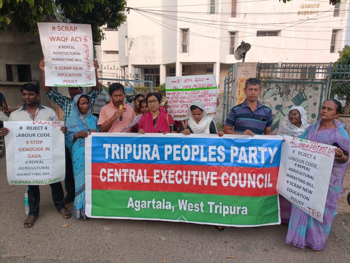আগরতলা : দেশব্যাপী কর্মসূচীর অঙ্গ হিসেবে রাজ্যেও দাবি দিবস পালন করলো ত্রিপুরা পিপলস পার্টি। মঙ্গলবার তারা ৫ দফা দাবির ভিত্তিতে রাজধানীর রবীন্দ্র ভবনের সামনে বিক্ষোভ দেখায়। তাদের দাবির মধ্যে ৪ টি শ্রম কোড বাতিল, গাজায় গণহত্যা বন্ধ,কৃষি বিপনন আইন বাতিল করার দাবিতে এদিনের কর্মসূচী। উপস্থিত ছিলেন ত্রিপুরা পিপলস পার্টির সাধারণ সম্পাদক বিমল সিংহ সহ অন্যরা।