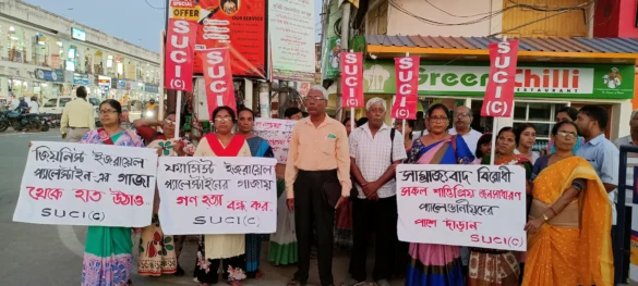 আগরতলা : গাজা ভূখণ্ডে প্যালেস্তাইনের নিরীহ মানুষকে বর্বরোচিত ভাবে হত্যা করছে জিওনিস্ট ইজরায়েল।বোমা বর্ষণ করে হাজার হাজার শিশু, নারী, বৃদ্ধ, যুবককে হত্যা করা হচ্ছে। এই আক্রমণের প্রতিবাদে বুধবার দেশব্যাপী প্রতিবাদ, যুদ্ধ বন্ধের দাবিতে এস ইউ সি আই কর্মসূচী গ্রহণ করে। এদিন বিকেলে দলের তরফে আগরতলায়ও হয় বিক্ষোভ কর্মসূচী। ওরিয়েন্ট চৌমুহনীতে দলের নেতা-কর্মীরা প্ল্যাকার্ড নিয়ে বিক্ষোভ সভায় শামিল হয়।উপস্থিত ছিলেন এসইউসিআই-র রাজ্য সম্পাদক অরুন ভৌমিক সহ অন্যরা। এদিন বিক্ষোভ সভা থেকে আওয়াজ উঠে অবিলম্বে গাজা ভূখণ্ডে গণহত্যা, যুদ্ধ বন্ধ করা, সাম্রাজ্যবাদের শিরোমণি আমেরিকা ইজরায়েলকে মদত দেওয়া বন্ধ করা, ভারত সরকার দেশের সাম্রাজ্যবাদ বিরোধী ঐতিহ্য রক্ষা করে স্বাধীনতাকামী প্যালেস্তাইনের জনগণের পাশে দাঁড়ানোর আওয়াজ উঠে।