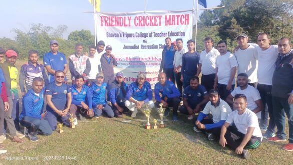 কলেজকে হার মানতে হয়েছে। ম্যাচের শেষে এক বর্ণাঢ্য অনুষ্ঠানে ভবনস্ কলেজের অধ্যক্ষ ড. রজত দে, ভারতীয় বিদ্যাভবন-এর চেয়ারপার্সন দেবাশীষ চক্রবর্তী, জার্নালিস্ট রিক্রিয়েশন ক্লাবের সভাপতি সুপ্রভাত দেবনাথ প্রমূখ বিজয়ীদের হাতে পুরস্কার তুলে দেন। খেলা শুরুর আগে মনোজ্ঞ মতবিনিময় ও আলোচনাচক্র অনুষ্ঠানে উপস্থিত বিশেষ অতিথি সর্বভারতীয় স্পোর্টস জার্নালিস্ট ফেডারেশনের সহ-সভাপতি তথা জেআরসি-র অন্যতম উপদেষ্টা সরযূ চক্রবর্তী, বরিষ্ঠ সাংবাদিক সুজিত চক্রবর্তী, অধ্যক্ষ ড. রজত দে প্রমূখ সংক্ষিপ্ত বক্তৃতায় উদ্যোক্তাদের ভূয়ষী প্রশংসা করেন। জেআরসি-র সভাপতি সুপ্রভাত দেবনাথ, সাধারণ সম্পাদক অভিষেক দে এ ধরনের প্রীতি ম্যাচ আয়োজনে ভবনস্ ত্রিপুরা কলেজ পরিবার সহ সংশ্লিষ্ট সকলকে ধন্যবাদ জানান এবং আগামী দিনেও এই ম্যাচ জারি থাকবে বলে প্রত্যাশা ব্যক্ত করেন। প্রীতি ক্রিকেট ম্যাচ ও সামগ্রিক অনুষ্ঠানের সুষ্ঠু আয়োজনে আম্পায়ার বসন্ত কর্মকার, প্রিয়তোষ রায়, উপস্থাপনায় অপরাজিতা ব্যানার্জি, ব্যবস্থাপনায় মালা মোদক, সঞ্চিতা মজুমদার, রুনা গুহ এবং ধারাভাষ্যকার নীলাদ্রি সাহার ভূমিকাও ছিল অনস্বীকার্য।