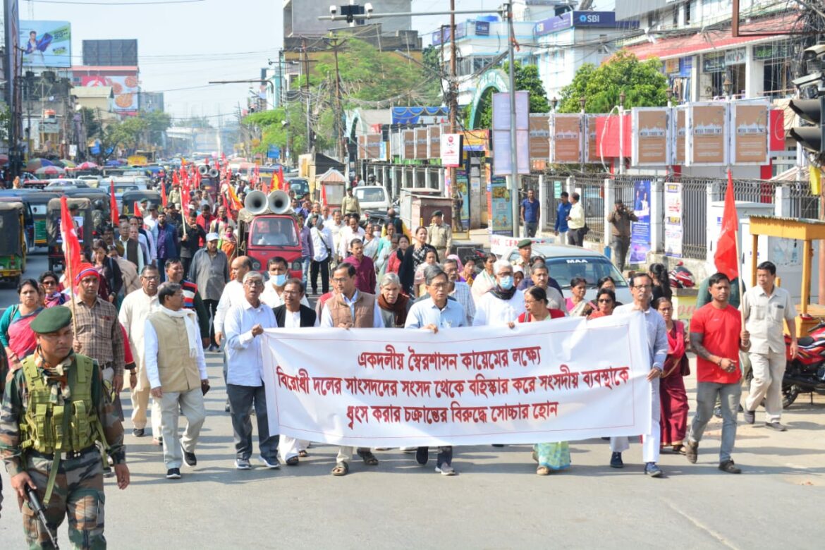আগরতলা : দেশে তানাশাহী সরকার চলছে।এর বিরুদ্ধে রাস্তায় নেমে সোচ্চার হতে সিপিআইএম ত্রিপুরা রাজ্য কমিটির সম্পাদক জিতেন্দ্র চৌধুরী আহ্বান জানান।সংসদ থেকে নজিরবিহীন ভাবে ১৪৬ জন সাংসদ সাসপেন্ড হবার প্রতিবাদে”ইন্ডিয়া” জোট সারা দেব্যাপী যে প্রতিবাদ দিবসের ডাক দিয়েছিল তার অঙ্গ হিসেবে ৫ বাম দলের ছিল মিছিল।পরে ওরিয়েন্ট চৌমুহনিতে সভায় এই প্রতিবাদ কর্মসূচি ব্যাখ্যা করে বক্তব্য রাখেন প্রাক্তন সাংসদ তথা বামফ্রন্টের আহ্বায়ক নারায়ণ কর।জিতেন চৌধুরী বলেন কয়েকটা জনবিরোধী বিলকে আইনী রূপ দিতে সংসদকে বিরোধী শূন্য করা হয়েছিল।মানুষের কন্ঠরোধ করতে সংসদকে বিরোধীশূন্য করে বিজেপি সরকার তার তানাশাহী রূপ স্পষ্ট করেছে বলে জিতেনবাবু অভিযোগ করেন।তিনি বলেন একজন বিজেপি সাংসদের দেওয়া পাস নিয়ে দুজন বহিরাগত সংসদ কক্ষে ঢুকে সংসদের নিরাপত্তা ব্যবস্থাকে ভেঙে ফেলে।বিরোধীদলের সাংসদদের দাবি ছিল প্রধানমন্ত্রী ও স্বরাষ্ট্রমন্ত্রী সংসদে বিবৃতি দিন।এই সামান্য কারণে সাংসদদের বহিষ্কার করতে হবে? তিনি বলেন উদ্দেশ্য স্পষ্ট হয়েছে পরে যখন জনবিরোধী বিলকে আইনে পরিণত করল বিরোধীহীন সংসদে।তিনি বলেন বিজেপি সরকার কালো টাকার জোরে মানুষকে ভুল বুঝিয়ে কিছু নির্বাচন জিতেও বুঝেছে তাদের সময়ে শেষ হয়েছে তাই মানুষের মুখবন্ধ করতে স্বৈরতন্ত্রের দিকে দেশকে নিয়ে যাচ্ছে।বিরোধীদের ঐক্যবদ্ধ চেহারা দেখে বিজেপি সরকার ভয় পেয়েছে বলে তিনি মন্তব্য করেন ।এদিন ভানু ঘোষ স্মৃতি ভবন থেকে বিশাল মিছিল শহর পরিক্রমা করে ওরিয়েন্ট চৌমহনিতে সভায় মিলিত হয়।মিছিলে ছিলেন প্রাক্তন মুখ্যমন্ত্রী মানিক সরকার, সিপিএম নেতা শঙ্কর প্রসাদ দত্ত, পবিত্র কর, নারায়ণ কর সহ অন্যরা।