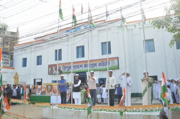 আগরতলা : দেখতে দেখতে পেরিয়ে গেল ১৩৮ বছর। প্রতিবছর যথাযোগ্য মর্যাদায় সাড়া দেশের সঙ্গে রাজ্যেও উদযাপন করা হয় জাতীয় কংগ্রেসের প্রতিষ্ঠা দিবস। এবছর০ এর ব্যতিক্রম ঘটেনি। বৃহস্পতিবার কংগ্রেসের ১৩৯ তম প্রতিষ্ঠা দিবস পালন করা হয় রাজ্যের বিভিন্ন জায়গায়। ত্রিপুরা প্রদেশ কংগ্রেসের তরফে অনুষ্ঠান হয় প্রদেশ কার্যালয়ের সামনে। এদিন প্রথমে জাতীয় ও দলীয় পতাকা উত্তোলন করেন যথাক্রমে বিধায়ক গোপাল চন্দ্র রায় ও প্রদেশ কংগ্রেস সভাপতি আশিস কুমার সাহা। এর পর দলের প্রতিষ্ঠাতা নেতৃত্বদের প্রতিকৃতিতে শ্রদ্ধা নিবেদন করেন বিধায়ক সুদীপ রায় বর্মণ, গোপাল চন্দ্র রায়, প্রদেশ কংগ্রেস সভাপতি আশিস কুমার সাহা, প্রাক্তন বিধায়ক দিবাচন্দ্র রাংখল, মহিলা কংগ্রেসের সভানেত্রী শর্বাণী ঘোষ চক্রবর্তী সহ অন্যরা। কংগ্রেস ভবনের সামনে থেকে তারা যান গান্ধীঘাট শহীদ বেদীতে। সেখানে শহীদদের প্রতি শ্রদ্ধা জানালেন দলীয় নেতৃত্ব সহ কর্মীরা।প্রদেশ কংগ্রেস সভাপতি এদিন বলেন, দেশের মূল কাঠামোকে শক্তিশালী করার লক্ষ্যে অঙ্গীকারবদ্ধ তারা।