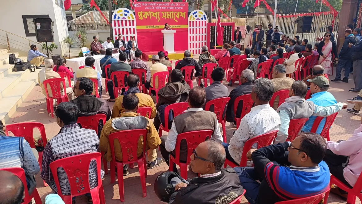 আগরতলা : লুন্টিত অধিকার গণতন্ত্র পুনরুদ্ধারের লড়াই তীব্র করো, সাম্প্রদায়িকতা মৌলবাদ ও ধর্মান্ধতার বিরুদ্ধে সম্প্রীতির দুর্গ গড়ো। এই আহ্বানে শুরু হল ত্রিপুরা কর্মচারী সমন্বয় কমিটি এইচ বি রোড-র রাজ্য সম্মেলন। শনিবার ত্রি-বার্ষিক রাজ্য সম্মেলন শুরু হয় আগরতলা টাউন হলে। সারা রাজ্যের প্রতিটি মহকুমা থেকে বাম কর্মচারী প্রতিনিধি সম্মেলনে যোগ দেন। দুইদিন ব্যাপী চলবে এই সম্মেলন। প্রথম দিন সকালে আগরতলা টাউন হল প্রাঙ্গণে হয় প্রকাশ্য সমাবেশ। পতাকা উত্তোলন, শহীদ বেদীতে মাল্যাদান করেন নেতৃত্ব। এদিকে সমাবেশে উপস্থিত ছিলেন সর্বভারতীয় রাজ্য সরকারি কর্মচারী সংগঠনের সাধারণ সম্পাদক এ শ্রী কুমার, সহ-সম্পাদক বিশ্বজিত গুপ্ত চৌধুরী, ত্রিপুরা কর্মচারী সমন্বয় কমিটির সাধারণ সম্পাদক স্বপন বল, চেয়ারম্যান মহুয়া রায় সহ অন্যরা।প্রকাশ্য সমাবেশে আলোচনা করতে গিয়ে সর্বভারতীয় নেতৃত্ব এদিন বিভিন্ন ইস্যুতে বিজেপি সরকারের সমালোচনা করেন, নেতৃত্ব অভিযোগ করেন, সরকারি দপ্তরে নিয়মিত চাকরিতে নিয়োগ। চুক্তিবদ্ধ, আউট সোর্সিং প্রথা, দৈনিক হাজিরার কাজ দেওয়া হচ্ছে।এদিকে এদিন প্রকাশ্য সমাবেশের পরে টাউন হলে সম্মেলনের কাজ শুরু হয়। দুই দিনের সম্মেলন থেকে আগামী কর্মসূচী ও আন্দোলন সূচীর রূপরেখা ঠিক হবে।