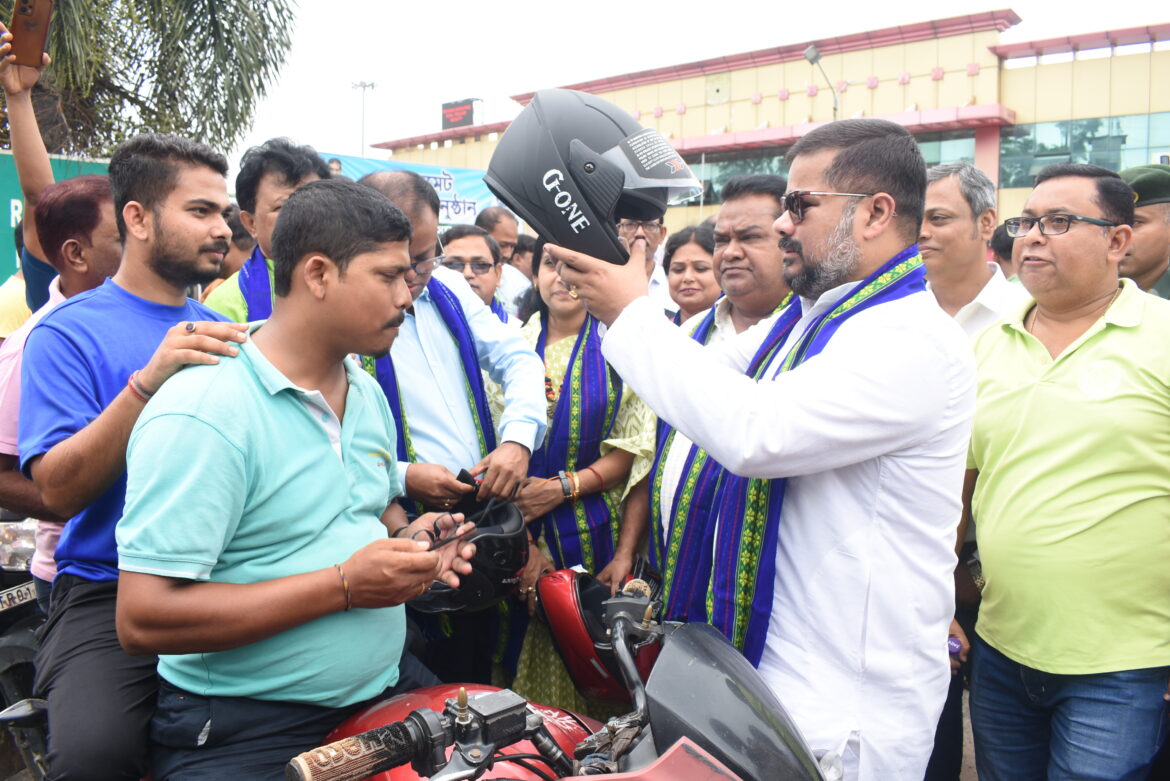 হেলমেটহীন চালকদের হেলমেট বিলি করলেন মন্ত্রী