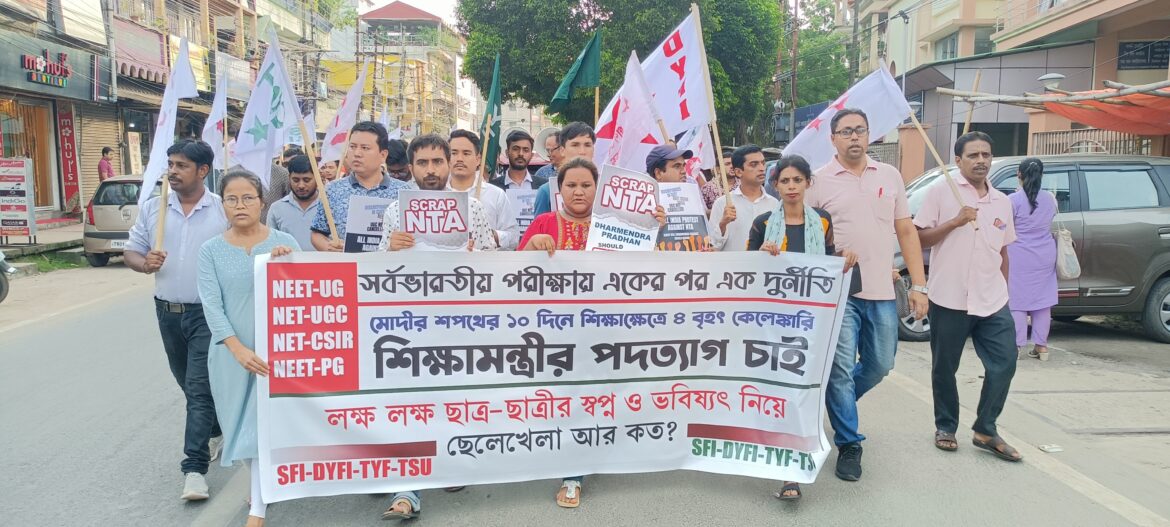 ত্রিপুরা আগরতলা : কেন্দ্রীয় শিক্ষামন্ত্রীর পদত্যাগের দাবি জানালো চারটি বামপন্থী ছাত্র-যুব সংগঠন। সোমবার আগরতলা শহরে বিক্ষোভ মিছিল করে ভারতের গণতান্ত্রিক যুব ফেডারেশন, উপজাতি যুব ফেডারেশন, ভারতের ছাত্র ফেডারেশন ও উপজাতি ছাত্র ইউনিয়ন। এদিন বিকেলে মেলারমাঠ ছাত্র-যুব ভবনের সামনে থেকে বের হয় বাম ছাত্র-যুবদের স্লোগান সোচ্চার মিছিল। শহরের বিভিন্ন পথ পরিক্রমা করে। মিছিলের নেতৃত্বে ছিলেন যুব নেতা পলাশ ভৌমিক, কৌশিক রায় দেববর্মা, কুমুদ দেববর্মা, ছাত্র নেতা সুলেমান আলি, সন্দীপন দেব, নেতাজী দেববর্মা, সুজিত ত্রিপুরা সহ অন্যরা। তাদের অভিযোগ সর্বভারতীয় পরীক্ষায় একের পর এক দুর্নীতি হচ্ছে। প্রধানমন্ত্রী নরেন্দ্র মোদীর শপথের দশদিনে শিক্ষাক্ষেত্রে চারটি বড় কেলেঙ্কারি হয়েছে। অভিযোগ সম্প্রতি নীট ইউ জি ও নীট পিজি প্রশ্নপত্র নিয়ে গুরুতর অভিযোগ উঠেছে। অভিযোগ নীট ইউ জি প্রশ্নপত্র কেলেঙ্কারি হয়েছে। বিপুল অর্থ লেনদেন হয়েছে। এনিয়ে সরব দেশের বিভিন্ন জায়গায় ছাত্র সংগঠন গুলি। বিশেষ করে বিরোধী ছাত্র সংগঠন গুলি। এদিন যুব নেতা পলাশ ভৌমিক বলেন, বহু ছাত্র- ছাত্রীর ভবিষ্যৎ আজকে বিপাকে। পড়ুয়াদের ভবিষ্যৎ খাদের কিনারায় এনে দাঁড় করিয়ে দিয়েছে বিজেপি সরকার। মিছিল থেকে তারা এদিন দাবি জানান অবিলম্বে এই শিক্ষা দুর্নীতির দায়িত্ব কাঁধে নিয়ে কেন্দ্রীয় শিক্ষামন্ত্রীকে পদত্যাগ করতে হবে।প্রকৃত দোষীদের চিহ্নিত করে শাস্তির ব্যবস্থা করতে হবে।