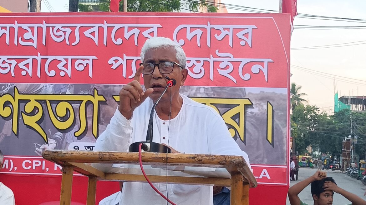 আগরতলা : পুঁজিবাদকে ধ্বংস করা না গেলে সাম্রাজ্যবাদ, ফ্যাসিবাদকে ধ্বংস করা যাবে না। তা করা না গেলে যুদ্ধ বন্ধ করা যাবে না। সোমবার ৫ বাম দলের তরফে প্রতিবাদ সভায় একথা বললেন প্রাক্তন মুখ্যমন্ত্রী মানিক সরকার। প্যালেস্তাইনের গাঁজা ভূখণ্ডে আক্রমণ চালাচ্ছে ইজরায়েল। বহু নিরিহ মানুষ মারা যাচ্ছে। এই আক্রমণের প্রতিবাদ জানিয়ে সারা দেশে এদিন প্রতিবাদ সভা করে ৫ বাম দল। এদিন রাজ্যেও হয় অনুরূপ কর্মসূচী। এদিন রাজধানীর প্যারাডাইস চৌমুহনীতে হয় সিপিএম, সিপিআই, আরএসপি, ফরওয়ার্ড ব্লক সহ ৫ দলের সভা। উপস্থিত ছিলেন প্রাক্তন মুখ্যমন্ত্রী মানিক সরকার, সিপিএম রাজ্য সম্পাদক জিতেন্দ্র চৌধুরী, ফরওয়ার্ড ব্লকের নেতা পরেশ সরকার, সিপিআই এম এলের নেতা পার্থ কর্মকার সহ অন্যরা। আলোচনা করতে গিয়ে মানিক সরকার গাজায় ইজরায়েলের আক্রমণের প্রতিবাদ জানান।তিনি ভারত সরকারের কাছে আহ্বান জানান প্রত্যক্ষ কিংবা পরোক্ষভাবে যাতে ভারতের কোন অস্ত্র ইজরায়েলের হাতে না যায় গাঁজা ভূখণ্ডে ব্যবহারের জন্য। মানিক সরকার বলেন, শ্রেণীহীন শোষণমুক্ত রাষ্ট্র ব্যবস্থা ভারতের বুকে গঠনের জন্য লড়াই করা হচ্ছে। গাজায় যে অমানবিক ঘটনা চলছে এনিয়ে বামপন্থীরা নির্বাক থাকতে পারে না। এজন্য সোচ্চার হচ্ছে বামেরা। যে লড়াই চলছে দেশেও একে ব্যাপক করার আহ্বান মানিক সরকারের।