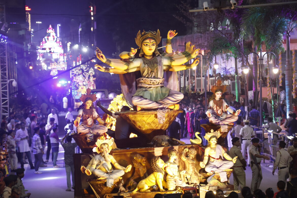 আগরতলা : জাতি-জনজাতি সহ সকলে মিলে ত্রিপুরা রাজ্যে দুর্গা পুজায় শামিল হয়। উভয় সম্প্রদায়ের মানুষ মিলে এক ত্রিপুরা শ্রেষ্ঠ ত্রিপুরা গড়তে হবে। এবার জনজাতি এলাকায়ও দুর্গা পূজা হয়েছে।রাজধানীর মহারানী তুলসীবতি বালিকা বিদ্যালয়ের সামনে মায়ের গমন কার্নিভ্যালের উদ্বোধন করে এই কথা বলেন মুখ্যমন্ত্রী ডাঃ মানিক সাহা।প্রতিবছরের মতো এই বছরও তথ্য ও সংস্কৃতি দপ্তরের উদ্যোগে হয় মায়ের গমন অনুষ্ঠান। তবে এই বছর মায়ের গমন অনুষ্ঠানের স্থান পরিবর্তন করা হয়েছে।