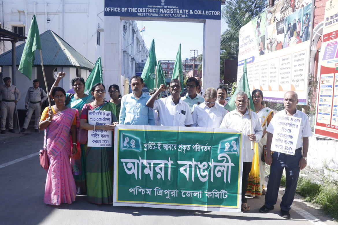 আগরতলা : পশ্চিম জেলা শাসক সকাশে আমরা বাঙালী। শুক্রবার ৭ দফা দাবি আদায়ের লক্ষ্যে পশ্চিম জেলার জেলা শাসকের কাছে ডেপুটেশন দিল আমরা বাঙালী পশ্চিম জেলা কমিটি। শুক্রবার আমরা বাঙালী পশ্চিম জেলা কমিটির পক্ষ থেকে এক প্রতিনিধিদল পশ্চিম ত্রিপুরা জেলার জেলা শাসকের কার্যালয়ে গিয়ে ডেপুটেশন দেয়। প্রতিনিধি দলের এক সদস্য জানান জনস্বার্থ সম্বলিত ৭ দফা দাবি নিয়ে মুখ্যমন্ত্রীর উদ্দেশ্যে পশ্চিম জেলার জেলা শাসকের নিকট ডেপুটেশান প্রদান করা হয়েছে।তাদের দাবির মধ্যে রয়েছে মহিলা সংক্রান্ত অপরাধের ঘটনায় পুলিস যাতে নিরপেক্ষা ভূমিকা নেয়।